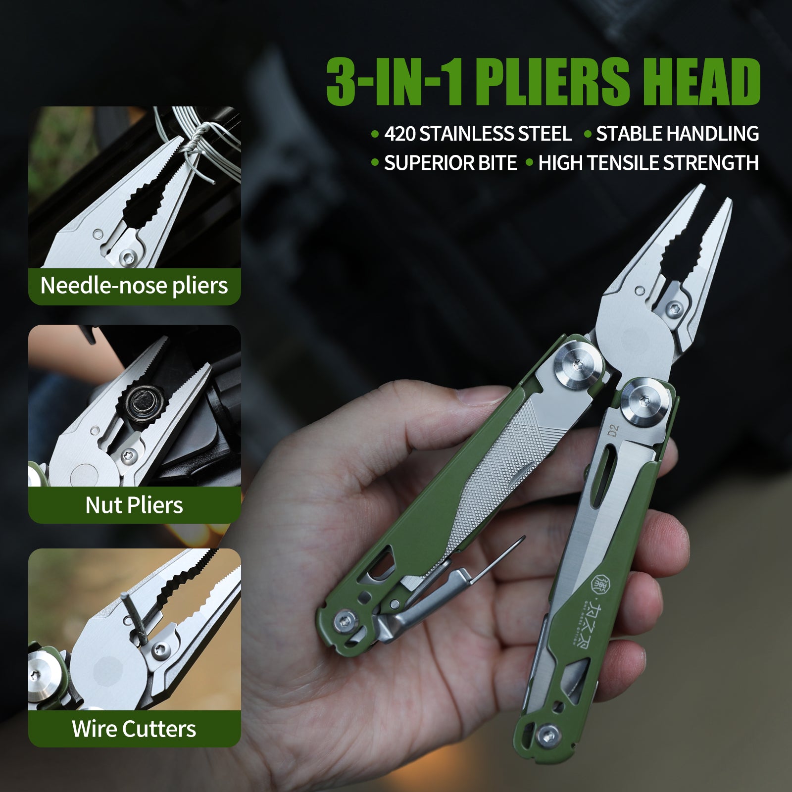 Took this on a camping trip. The blade handled whittling wood fine. Just remember D2 isn't fully stainless, so wipe it down if it gets wet. The green color fits the outdoor vibe.