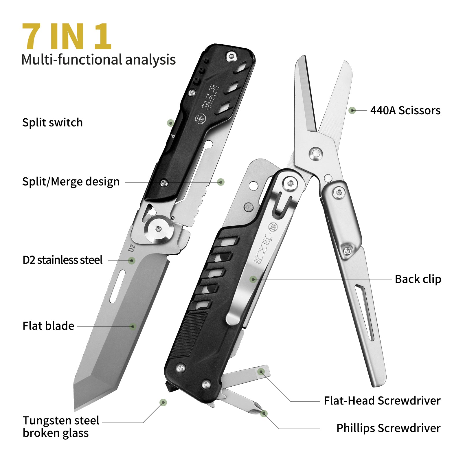 The versatility is unmatched. You get a high-end D2 knife and heavy-duty scissors. The split design is brilliant. Highly recommended for gadget lovers.